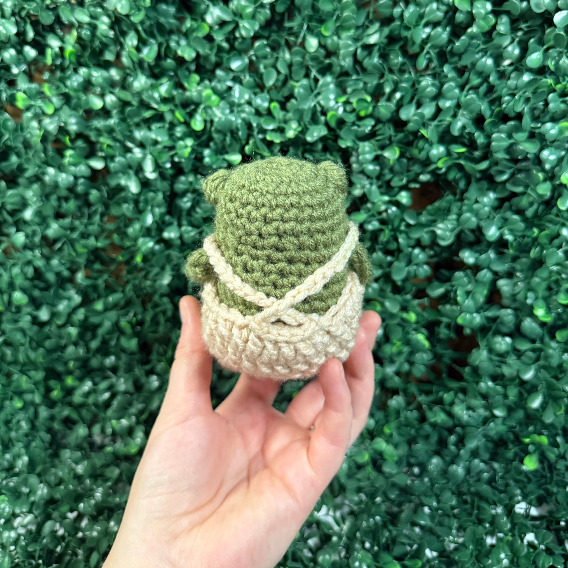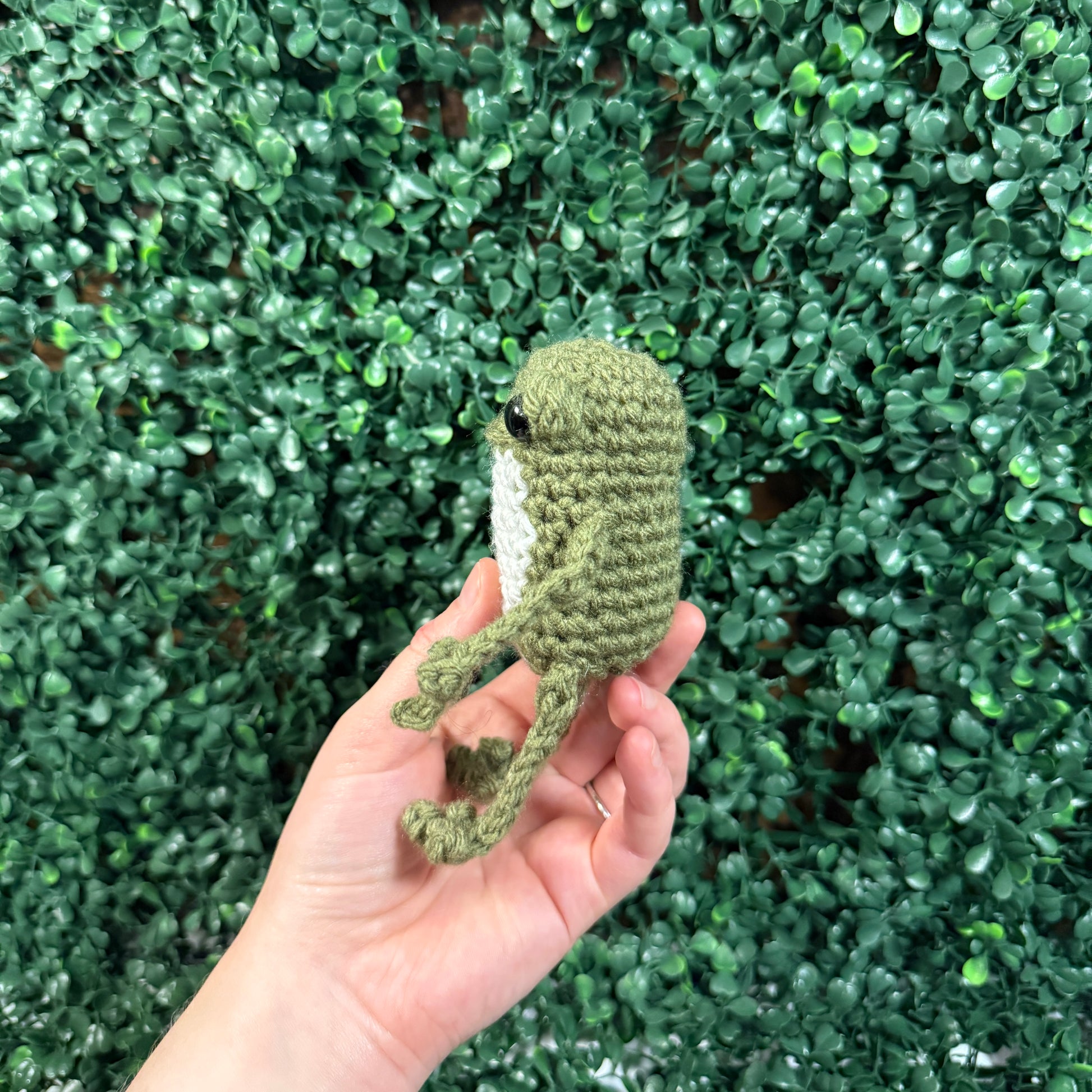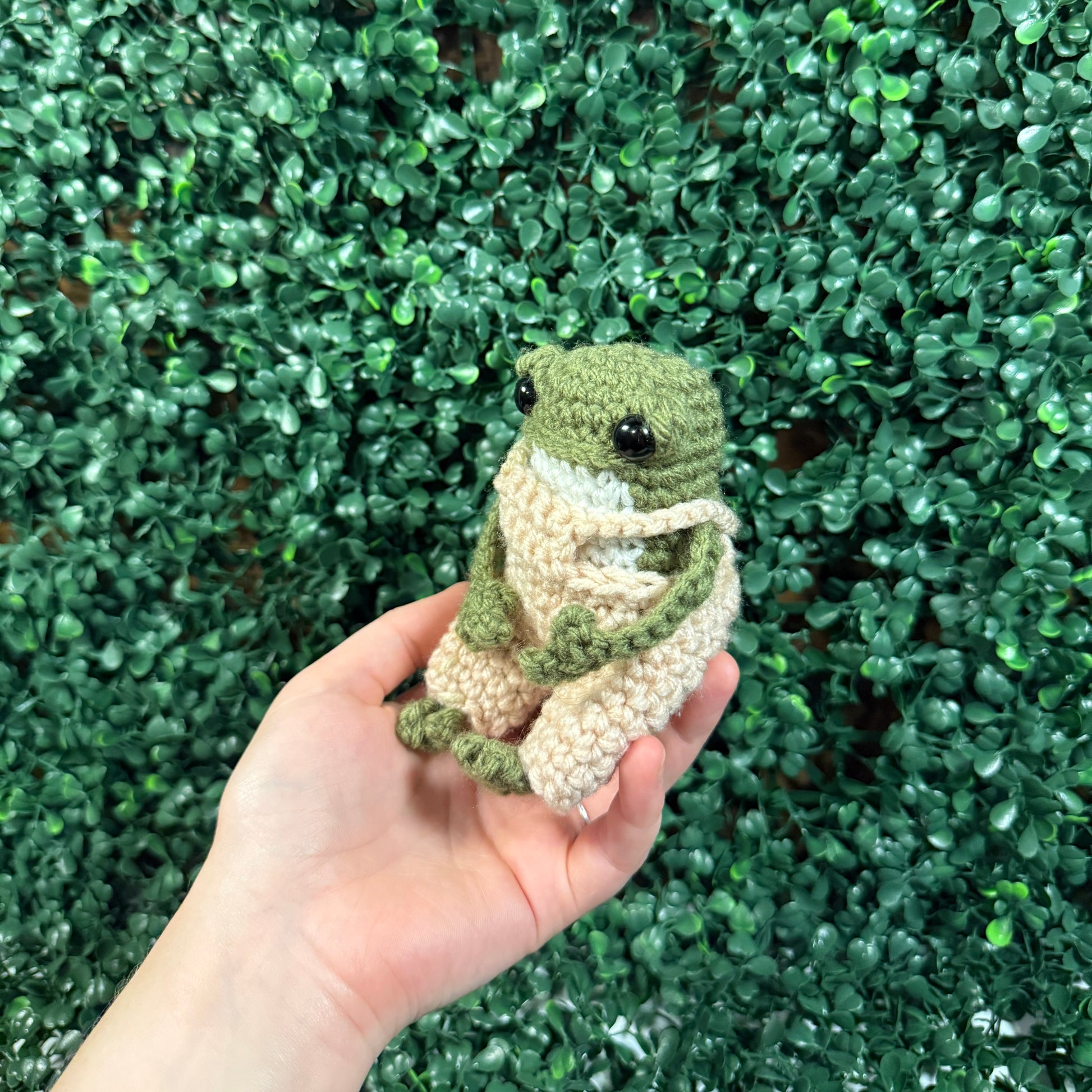 Say hello to the cutest little amphibian around! This sitting frog is lovingly handmade with durable yarn and features charming details from his gentle face to his tiny, removable overalls. With his long legs stretched out and his round eyes full of personality, this froggy friend is ready to hop into your heart. Perfect for cozy decor, gifting, or adding a whimsical touch to your collection, he’s equal parts cuddly and stylish. Ribbit, relax, and enjoy the charm!
